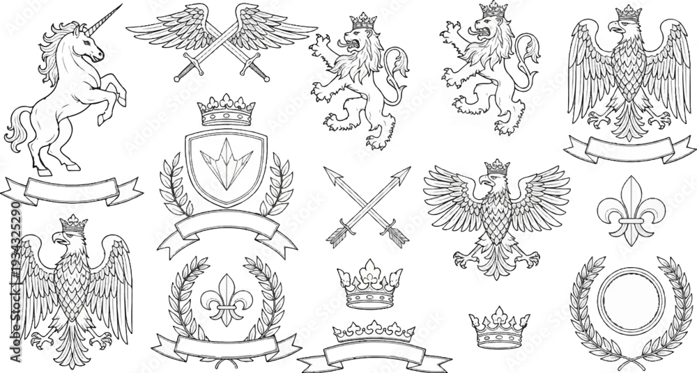 Obraz Collection of heraldic crests and emblems featuring mythical creatures, regal animals, and symbols of power