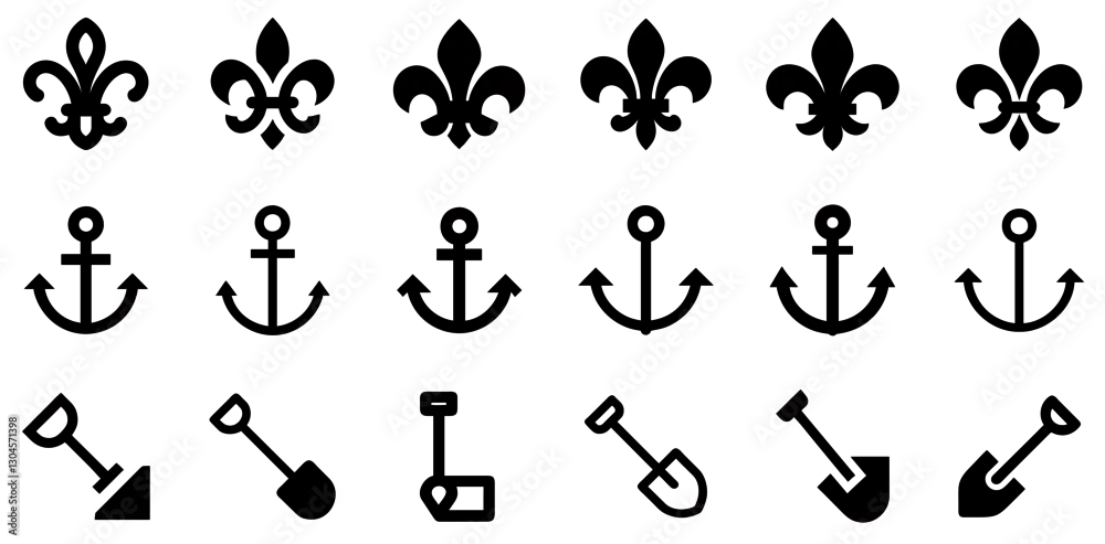 Obraz "Fleur de Lis, Anchor, and Shovel Icon Set – Heritage, Navigation, and Labor Vector Symbols"