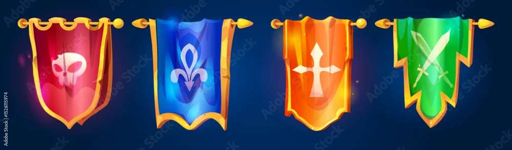 Medieval game flags on golden poles - green crossed swords banner, orange cross emblem, red skull pennant, blue fleur de lis standard. Magical fantasy kingdom banners with tassels rpg castle adventure