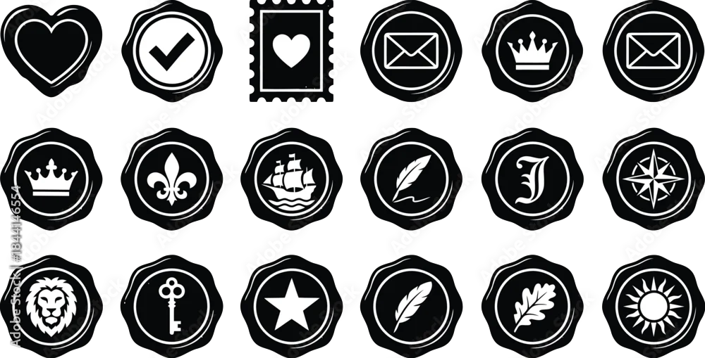 Obraz Retro sealing wax and certification badge black glyph icons. Heraldic fleur de lis, ship anchor, sun star, and antique key symbols for letter correspondence decoration graphic vector set art.
