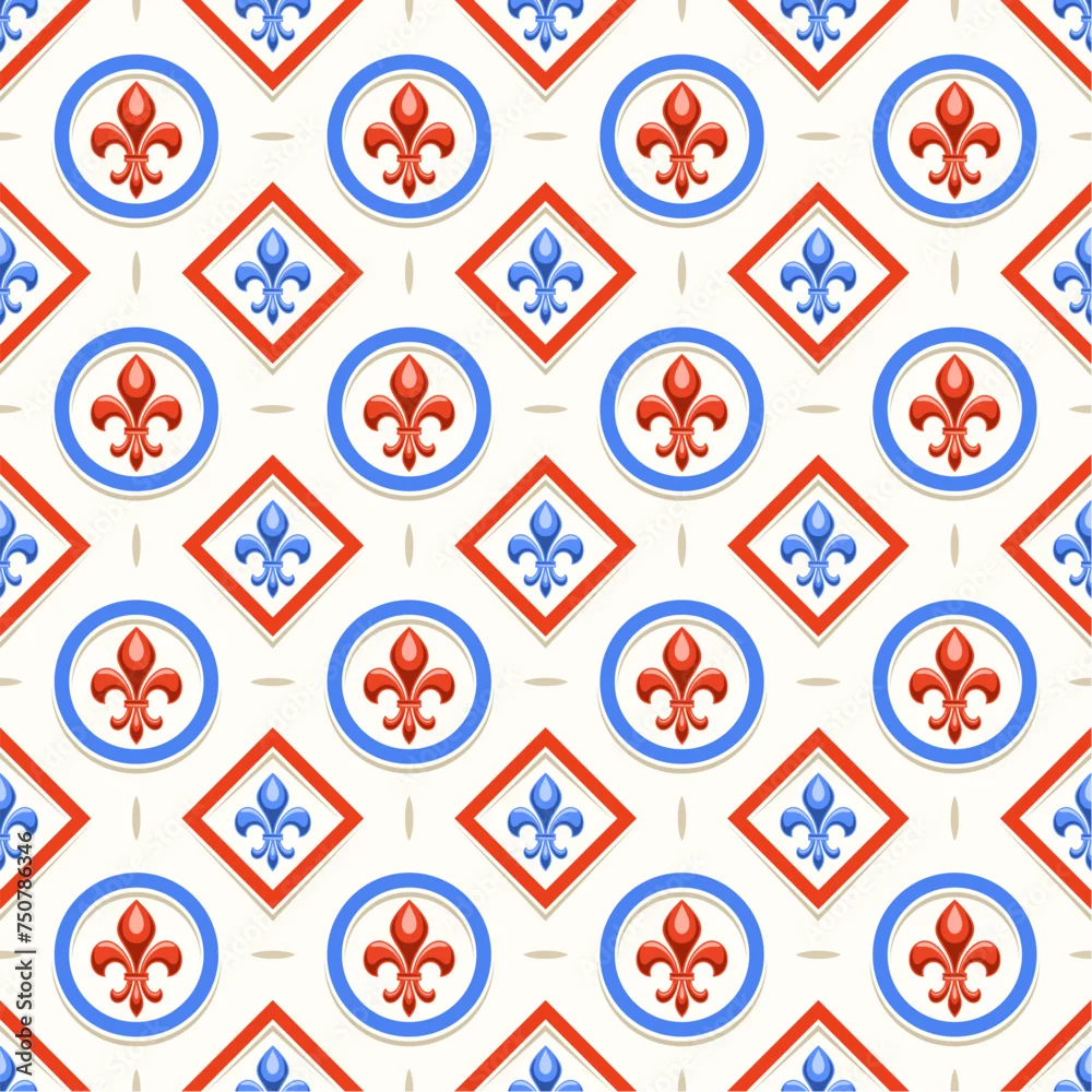 Obraz Vector Fleur de Lis Seamless Pattern, repeat background with illustrations of vintage pattern with fleur de lis in circle and rhombus cells, square poster with old french ornament on white background