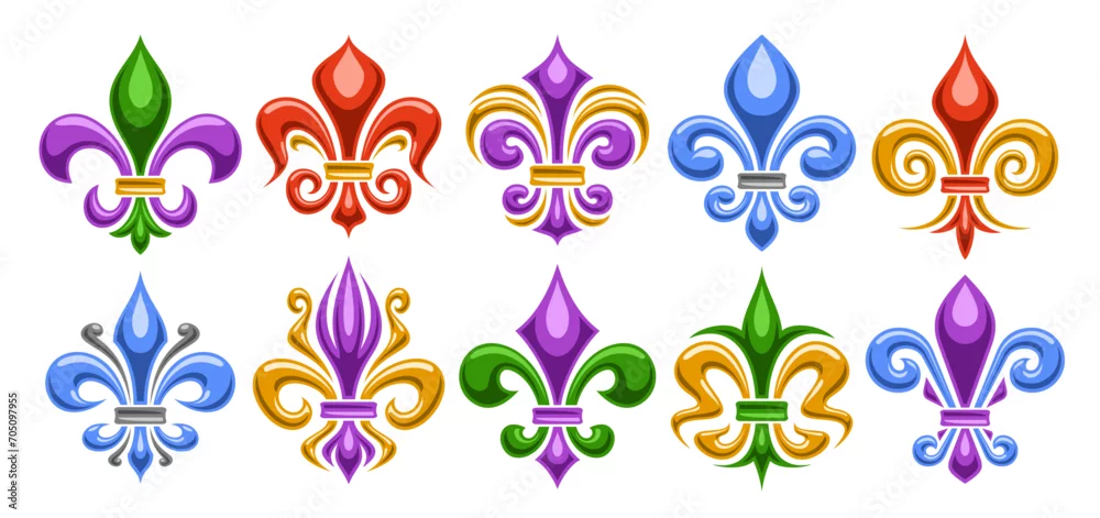 Vector Fleur de Lis set, horizontal banner with collection of 10 cut out illustrations of different colorful fleur de lis lily flowers, group of many various antique art symbols on white background