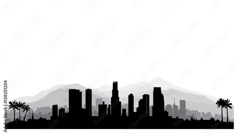Obraz Panoramę Los Angeles, USA. Sylwetka miasta z wieżowca, góry i palmy. Słynny amerykański gród