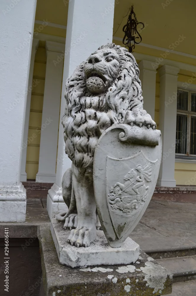 Obraz lwy z herbami przy schodach wejściowych do Pałacu Raczyńskich w Złotym Potoku - lwy - Picturewall.pl