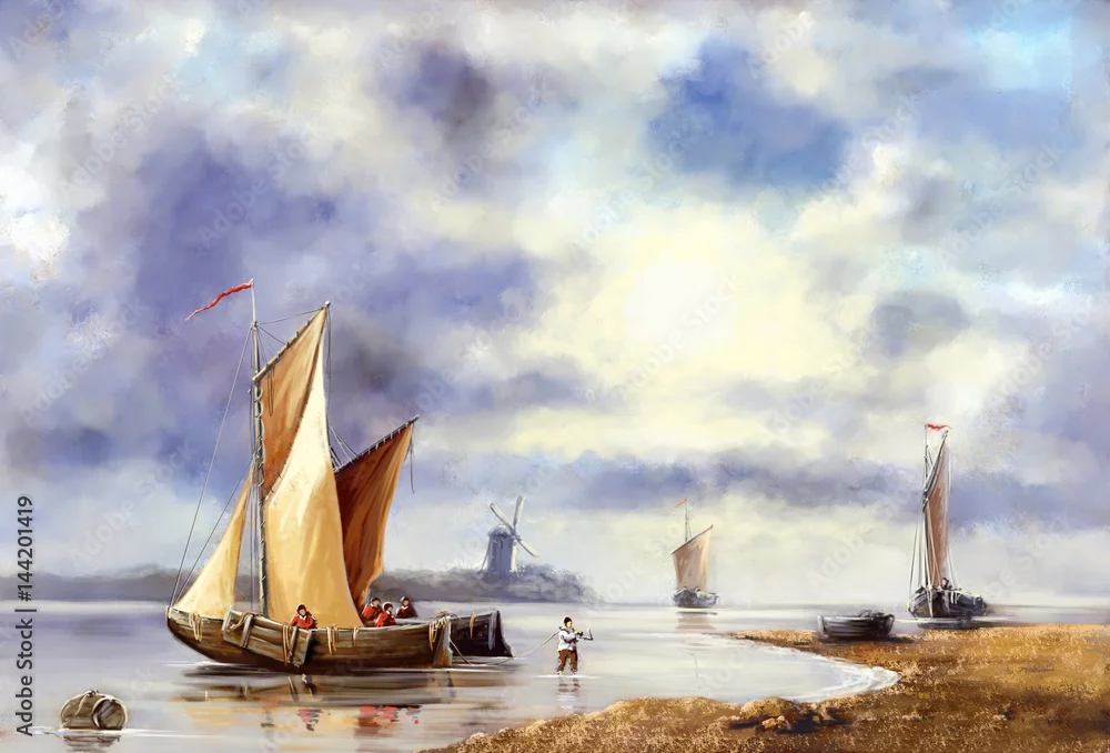 Obraz Klasyczne obrazy olejne. Pejzaż morski. Rybak i łódź. Sztuka cyfrowa.