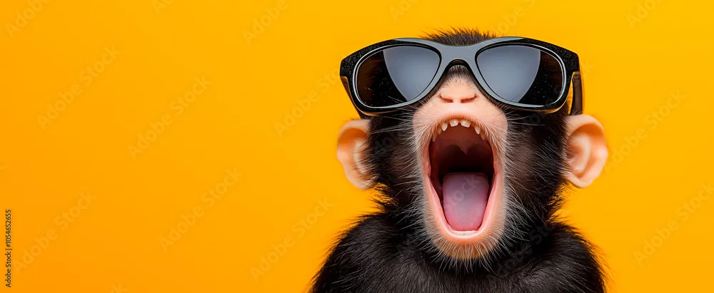 Obraz Adorable baby monkey wearing sunglasses with playful expression. Chimpanzee with stylish sunglasses.
