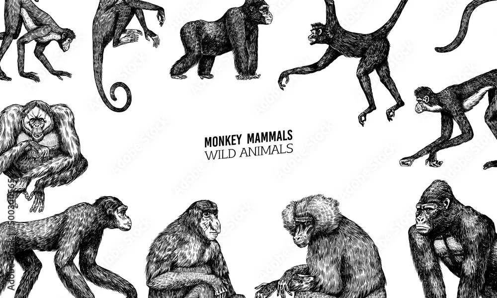 Obraz Bonobo or chimpanzee, Western gorilla , Orangutan. Vintage poster or banner. Colombian capuchin Proboscis monkey. Spider monkey or Southern muriqui . Hand drawn engraved sketch in woodcut style.