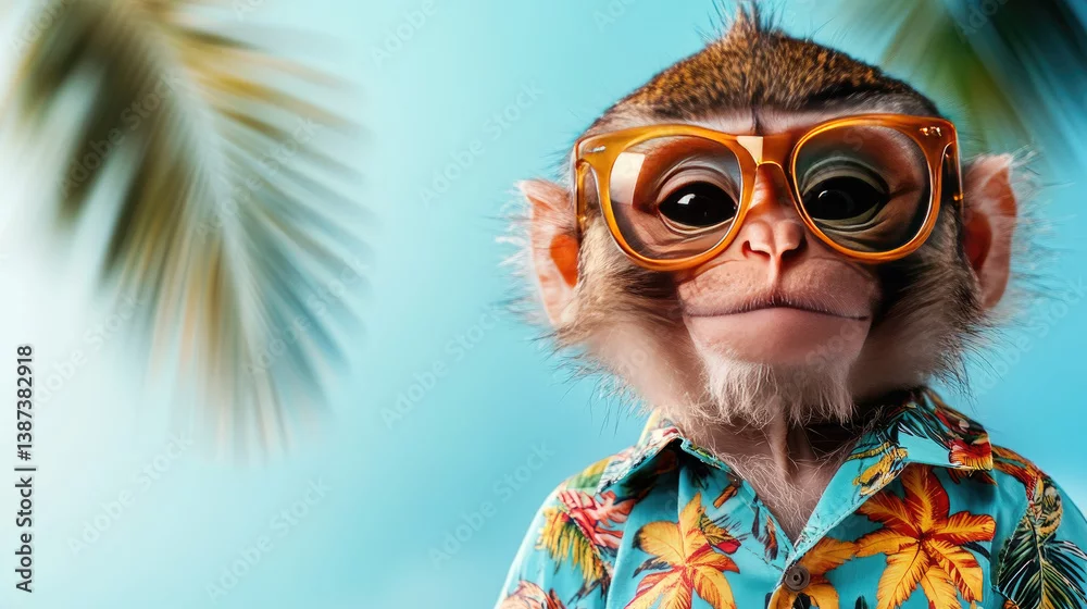 Obraz Cute capuchin monkey wearing a Hawaiian shirt and sunglasses relaxing on a tropical beach with palm trees and clear blue skies, enjoying a summer vacation. Funny meme with copy space and banner