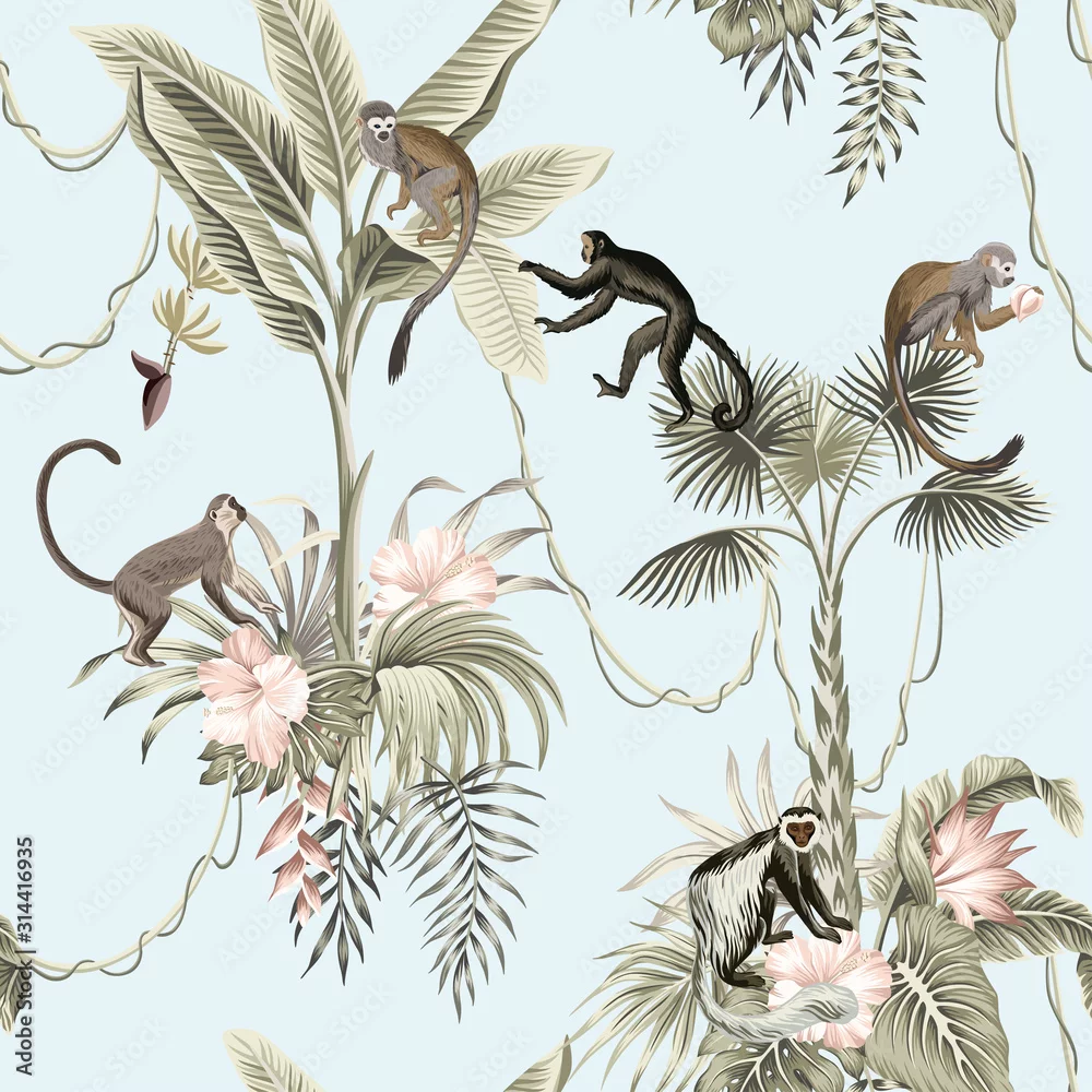Obraz Hawaiian vintage botanical palm tree,banana tree, palm leaves, hibiscus flower, liana, monkey animal summer paradise floral seamless pattern blue background.Exotic jungle wallpaper. - małpy - Picturewall.pl