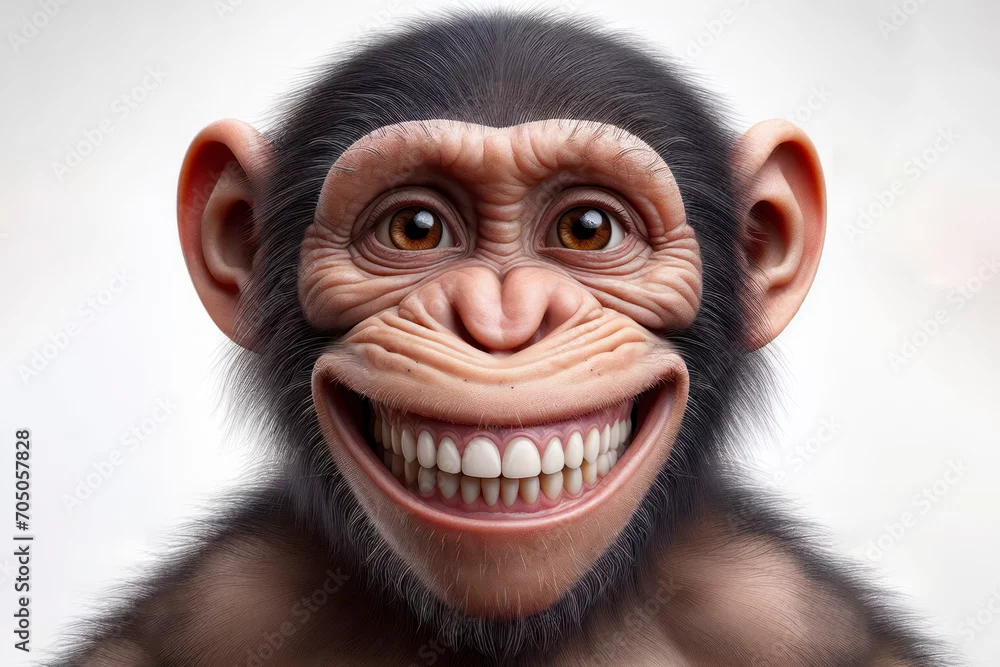 Obraz photorealistic portrait of a monkey with a big teeth smile and huge eyes on a white background. ai generative