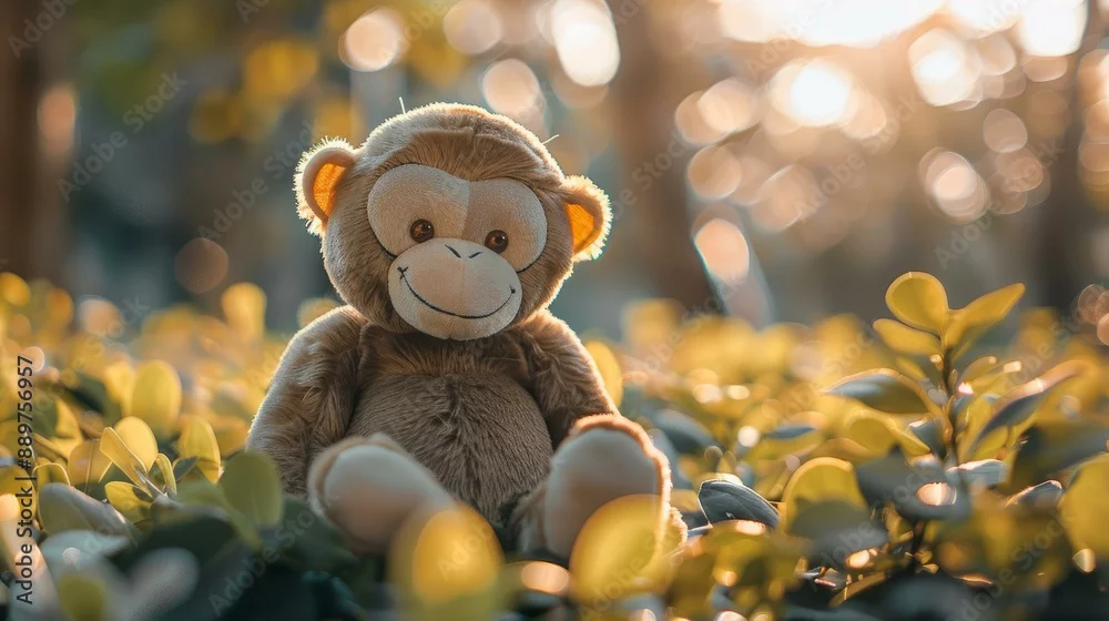 Obraz Plush monkey toy in nature with golden sunlight and bokeh, perfect for children's products and playful themes
