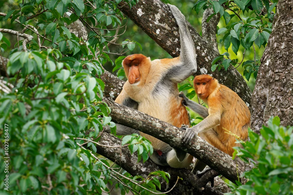 Proboscis Long-nosed Monkey Nasalis larvatus is arboreal monkey with large nose endemic to Borneo , reddish-brown skin color and a long tail, lives in mangrove forests, jumping and sitting