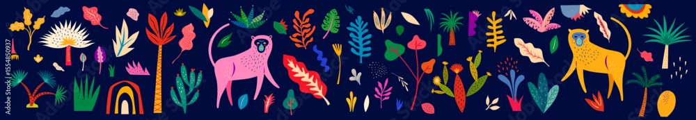 Obraz Vector colorful illustration with tropical flowers, leaves, monkey - małpy - Picturewall.pl