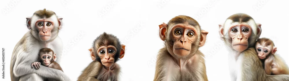 Wildlife zoo safari africa monkeys animals banner panorama long - Collection close up of group of monkey family with baby portrait, isolated on white background, Generative Ai