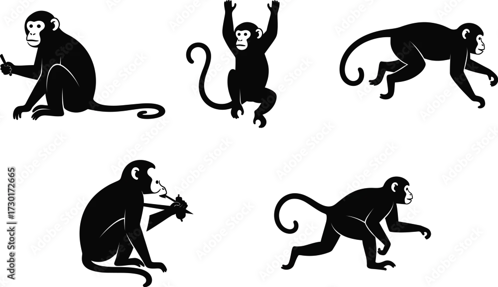 Obraz PrintMonkey silhouette illustration, animal poses vector, funny primate art, smoking monkey design, hanging monkey clipart, crawling monkey graphic, walking monkey icon