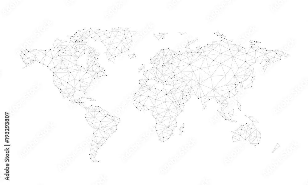 Obraz Blockchain technologii sieci wielokąt mapa świata na białym tle. Sieć, biznes fintech, e-commerce, handel bitcoinami i globalnej kryptowaluty blockchain biznes transparent koncepcja wektor