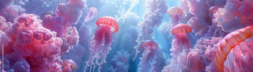 A beautiful and mesmerizing underwater scene featuring a group of jellyfish. The jellyfish are of various sizes and colors, and they are all swimming gracefully through the water.