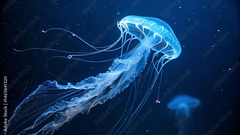 Bioluminescent jellyfish glowing against a dark background, creating a mesmerizing and ethereal oceanic scene, perfect for marine life art, underwater themes, and nature photography