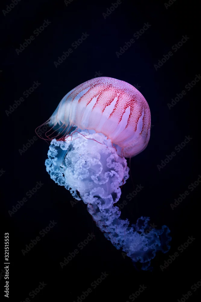 Obraz Jellyfish Japanese Sea Nettle (Chrysaora pacifica) poisionous jellyfish. Blue neon glow light effect. Close up of jellyfish on dark background. - meduzy - Picturewall.pl