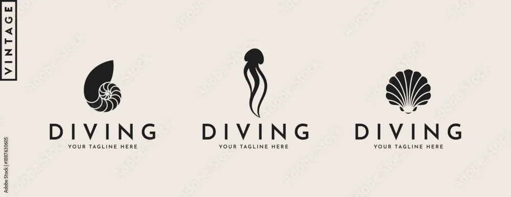 Obraz Sea life logo. Vintage style jellyfish scallop and nautilus shell
