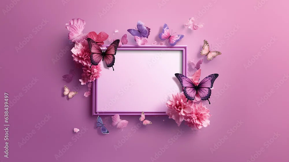 Obraz Bilderrahmen leer in Pink mit Blumen und Schmetterlinge dekoriert als Hintergrund und Grußkarte für Druckvorlage in Querformat, ai generativ