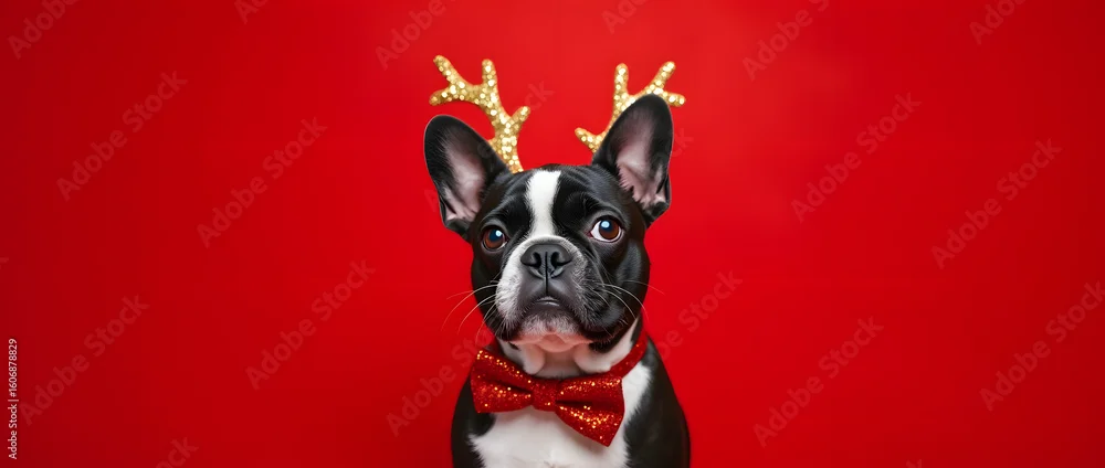 Obraz Bulldog noir avec nœud papillon rouge et cornes de renne, isolé sur fond rouge. concept Noël amusant