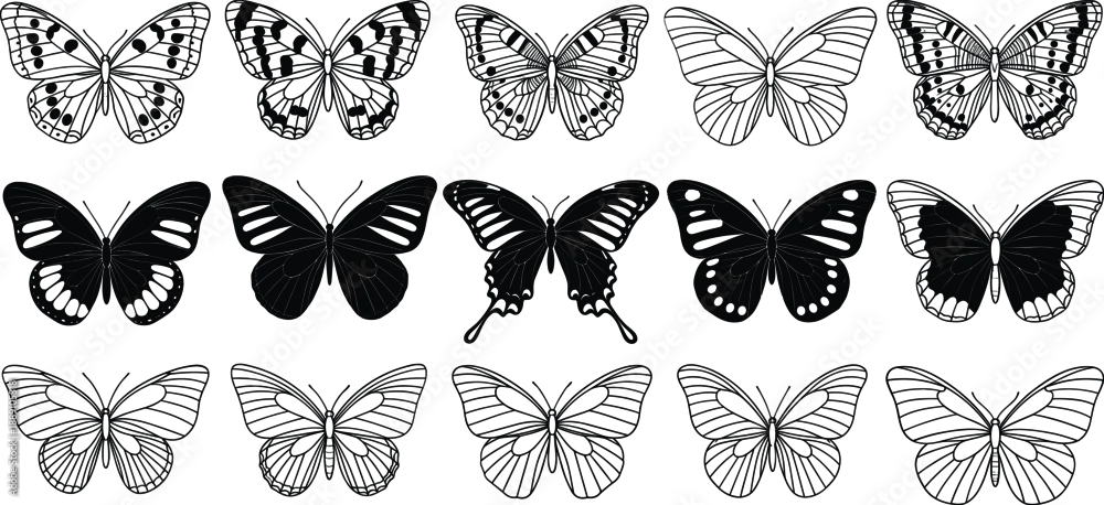 Obraz Butterfly silhouette and outline vector set with decorative insect wings in black and white tattoo style design - motyle - Picturewall.pl