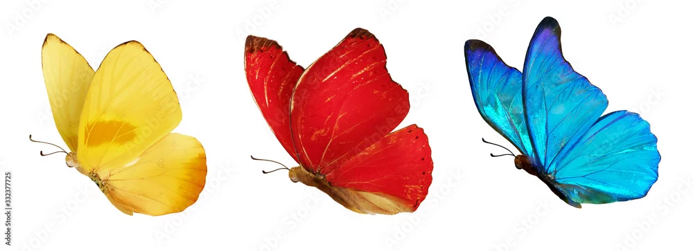 Obraz Set of beautiful blue, yellow and red butterflies. Cymothoe excelsa isolated on white background. Butterfly Nymphalidae and Butterfly Phoebis philea with spread wings and in flight.