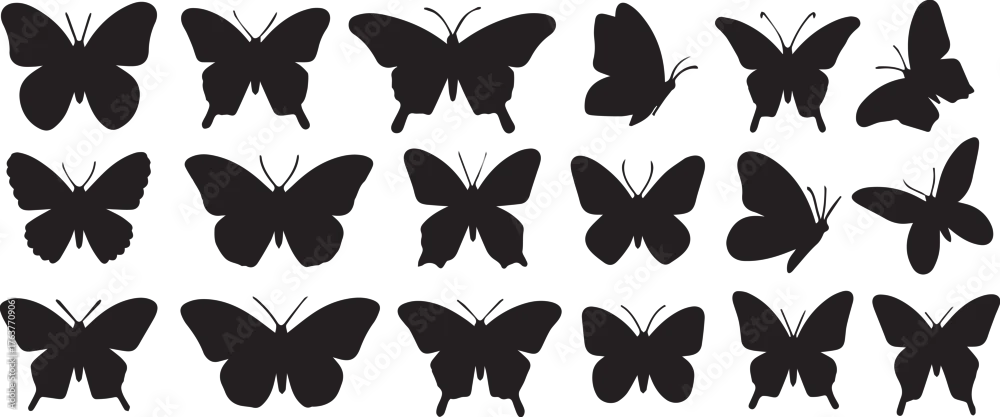 Obraz Black Silhouette Butterflies Set Assorted Wing Shapes, Isolated Insects, Flying Fantasy, Nature Illustration