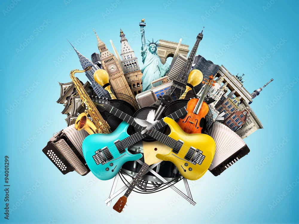 Obraz Kolaż muzyczny, instrumenty muzyczne i zabytki świata