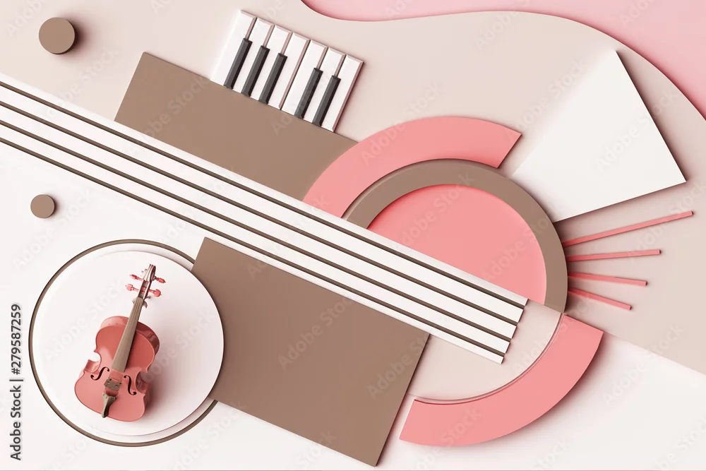 Koncepcja skrzypiec i instrumentów muzycznych, abstrakcyjna kompozycja platform o geometrycznych kształtach w pastelowym różowym odcieniu. Renderowania 3d