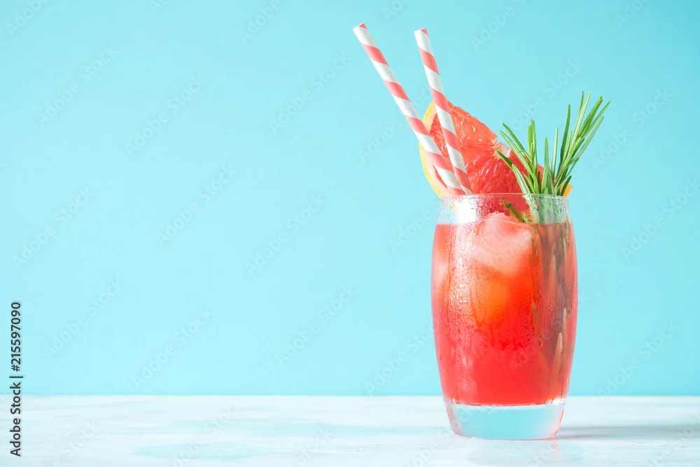 Obraz Orzeźwiający koktajl grejpfrutowy z lodem i rozmarynem na kolorowym tle mięty. Zdrowy letni napój cytrusowy.