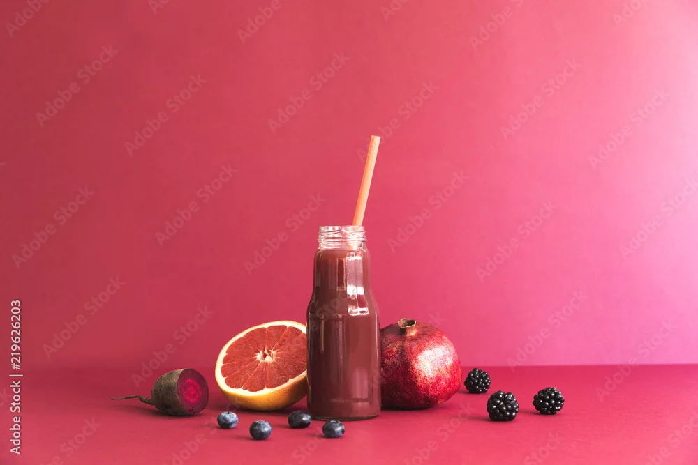 Obraz Zdrowy czerwony koktajl z czerwonymi warzywami i owocami leży na stole. Dieta Detox dla zdrowego ciała i umysłu.