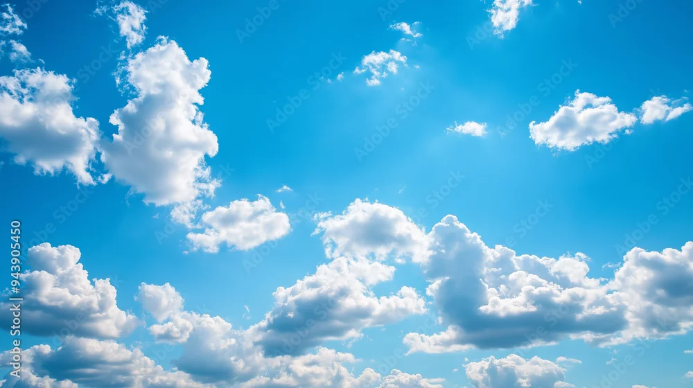 Obraz Cudowne niebo wypełniają białe cumulusowe chmury, które unoszą się leniwie na tle spokojnego, błękitnego nieba.