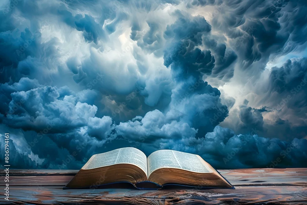 Obraz Otwarta Biblia leżąca na drewnianym stole na tle pochmurnego nieba