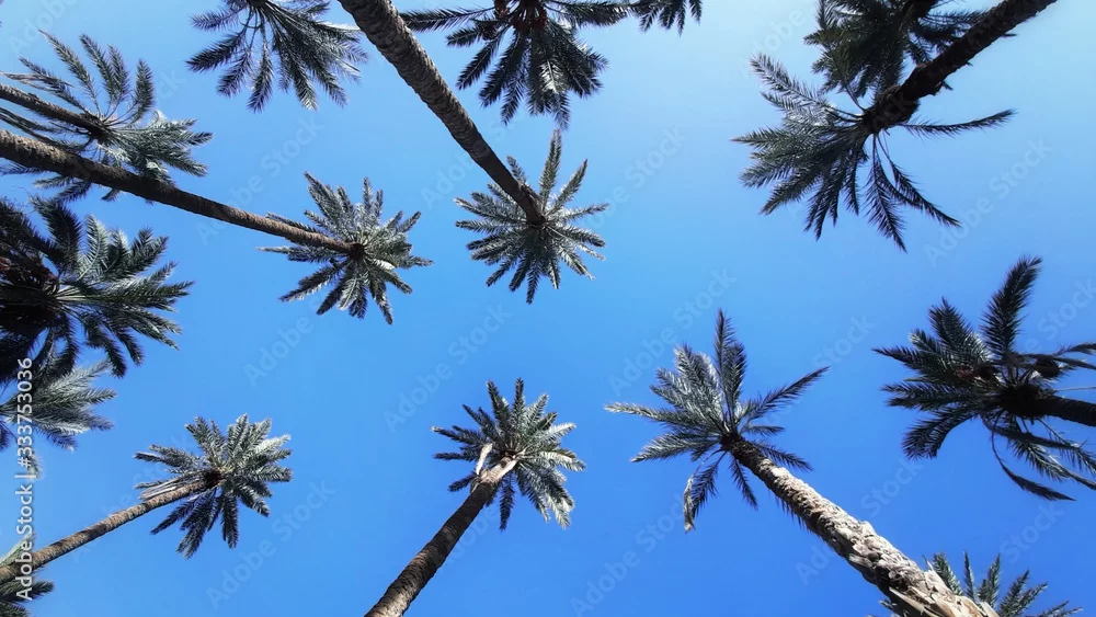 Obraz Palm tops made with fisheye lens . A lot of palm trees against the blue sky - niebo - Picturewall.pl