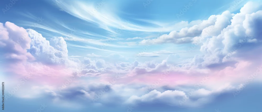 Obraz Panoramiczne błękitne tło z odcieniem różu - niebo z delikatnymi chmurami i obłokami - tron Boży, rajska światłość. Miejsce przebywania aniołów.