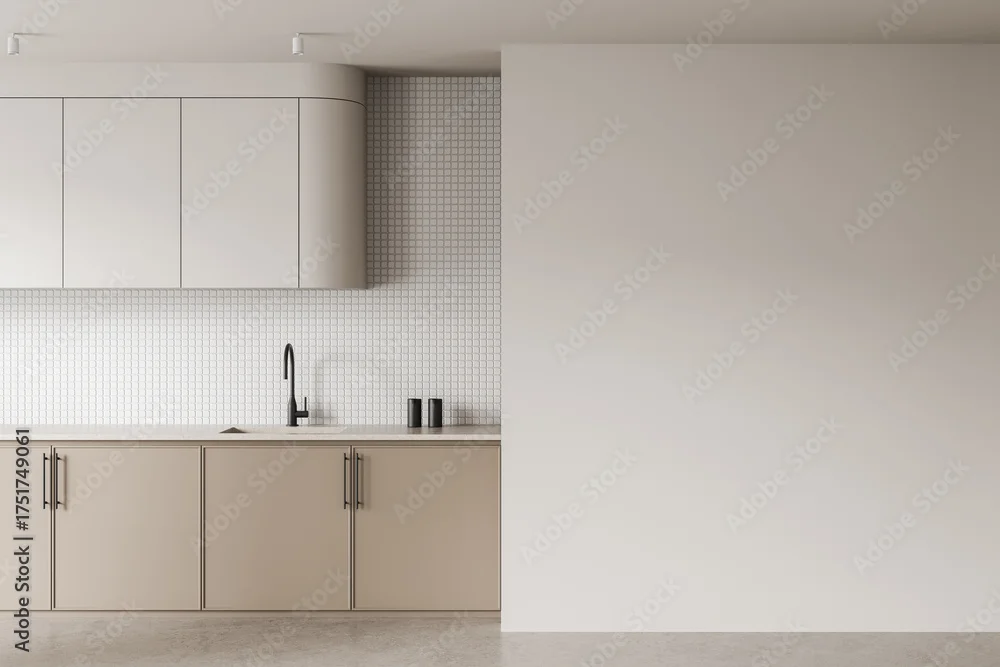 Obraz Modern kitchen interior with blank wall space and minimalist cabinetry for design or poster mockup template in neutral colors and clean architecture style. 3D Rendering