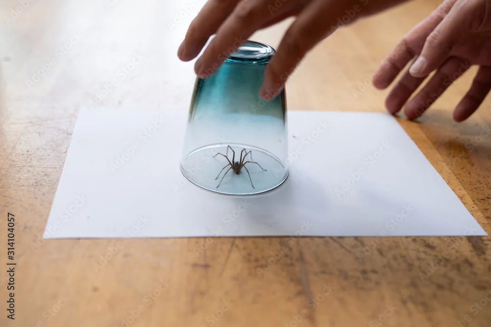 Caught big dark common house spider under a drinking glass on a smooth wooden floor seen from ground level in a living room in a residential home with two male hands
