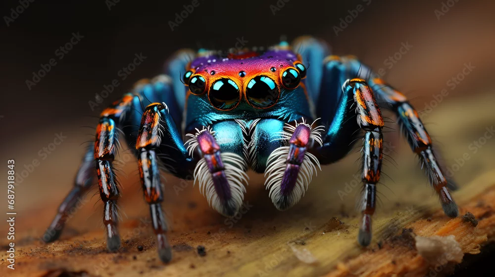 Photo of a vibrant peacock spider perched on a textured rock created, Close-up of the spider's head and beautiful eyes emerging. Nature beauty concept, A single Purple-Gold Jumping Spider perched