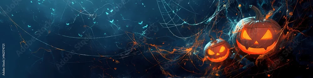 Obraz Pumpkin with scary smiling face in spider web on black background. Carved Jack o lantern pumpkin. Cartoon retro style. Happy Halloween. Border with copy space for design card, banner, invitation