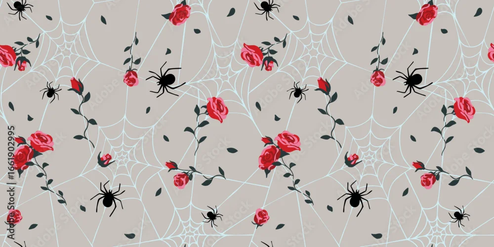 Obraz Seamless halloween pattern with spiderwebs, red roses and spiders - pająki - Picturewall.pl