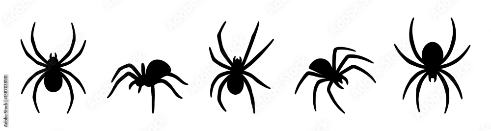 Set of black spider silhouettes in various positions. The collection features simple flat vector shapes with eight-legged arachnids depicted in different angles and movements