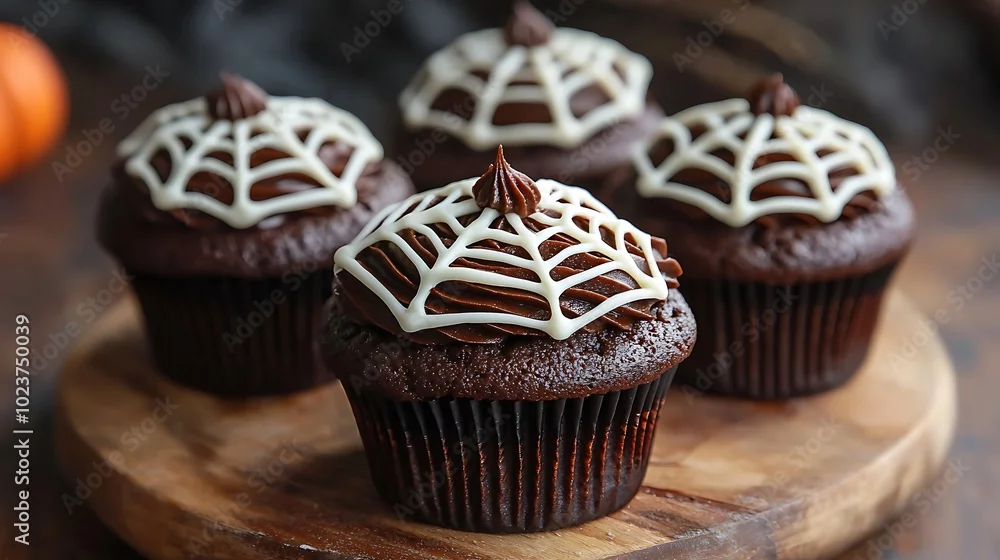 Obraz Spider web cupcakes, decorated with rich chocolate frosting and a white icing web, perfect for a creepy yet tasty treat,