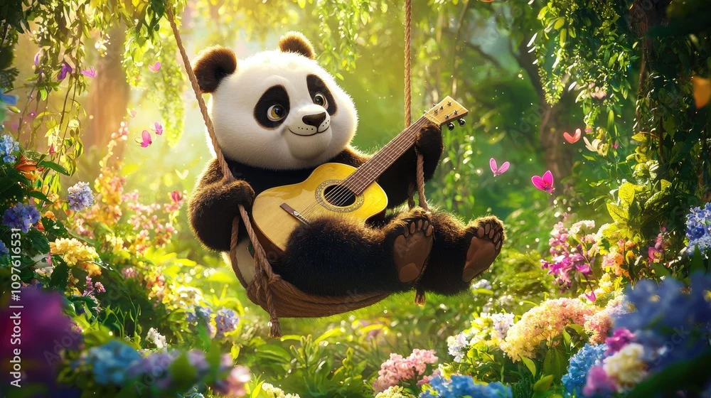 Obraz 6d A panda is Riding on a swing while playing guiter in a flower garden.