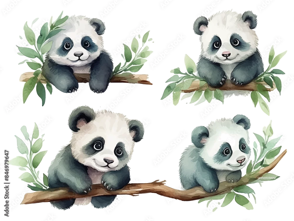 Obraz Set of cute baby panda bear on the tree branch watercolor isolated white background. Vector illustration