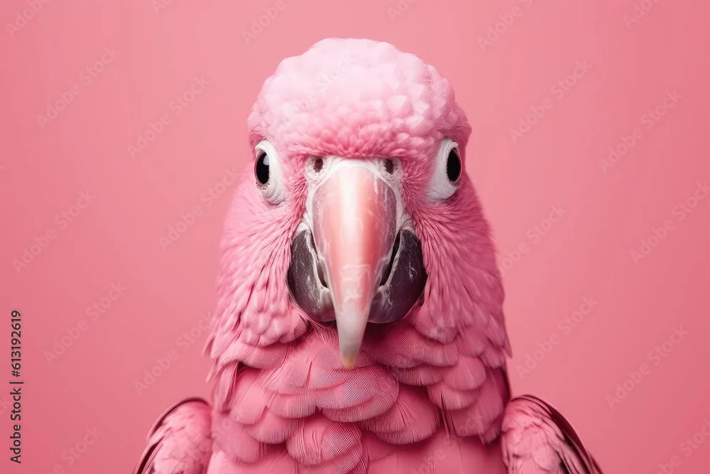Obraz Pink parrot on pink background | fluffy pink african parrot on pastel colored pink studio backdrop