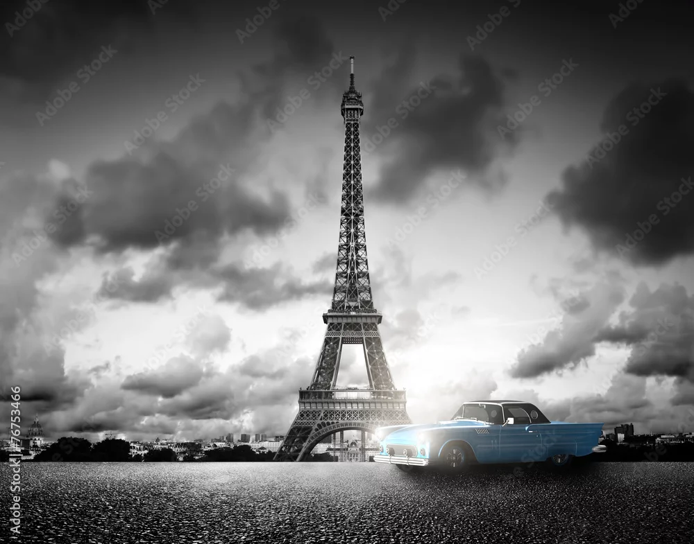 Obraz Effel Tower, Paryż, Francja i samochód retro. Czarny i biały