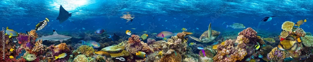 Obraz kolorowe super szerokie podwodne rafa koralowa panorama transparent tło z wielu ryb rekin żółw i życia morskiego