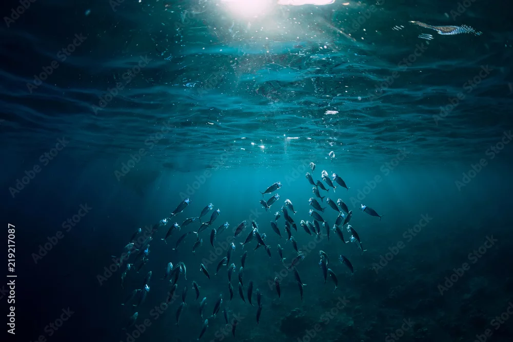 Obraz Podwodny świat ze szkolnymi rybami pływa nad rafą koralową i światłem słonecznym